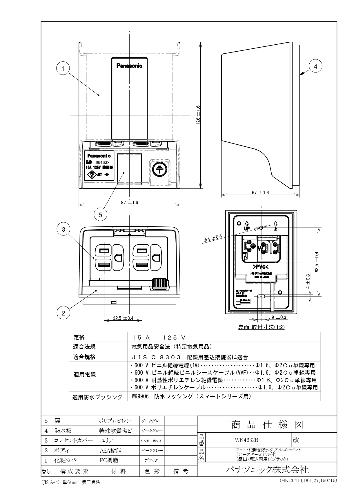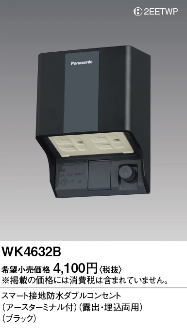 品番:WK4632B品名:スマート接地防水ダブルコンセント(アースターミナル付)(露出・埋込両用)(ブラック)