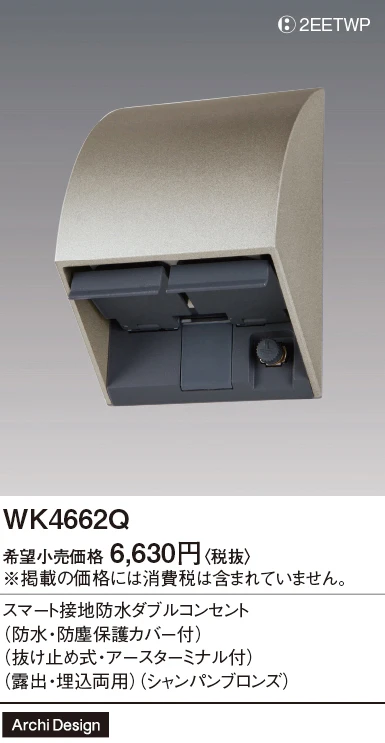 品番:WK4662Q品名:スマート接地防水ダブルコンセント(防水・防塵保護カバー付)(抜け止め式・アースターミナル付)(露出・埋込両用)(シャンパンブロンズ)