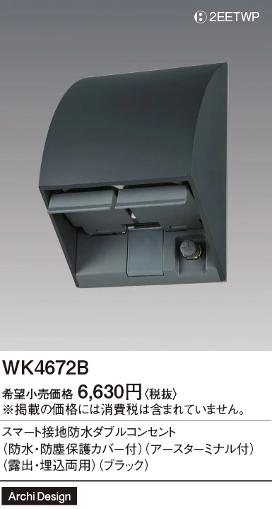 品番:WK4672B品名:スマート接地防水ダブルコンセント(防水・防塵保護カバー付)(アースターミナル付)(露出・埋込両用)(ブラック)