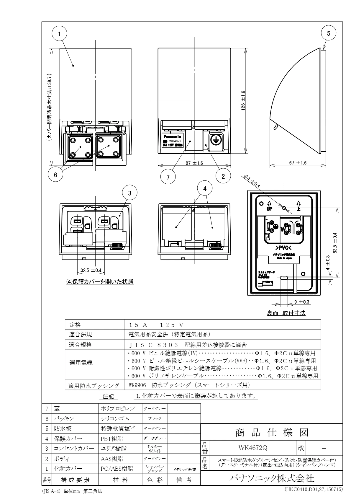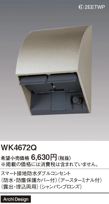 品番:WK4672Q品名:スマート接地防水ダブルコンセント(防水・防塵保護カバー付)(アースターミナル付)(露出・埋込両用)(シャンパンブロンズ)