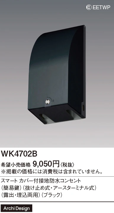品番:WK4702B品名:スマートカバー付接地防水コンセント(簡易鍵)(抜け止め式・アースターミナル式)(露出・埋込両用)(ブラック)