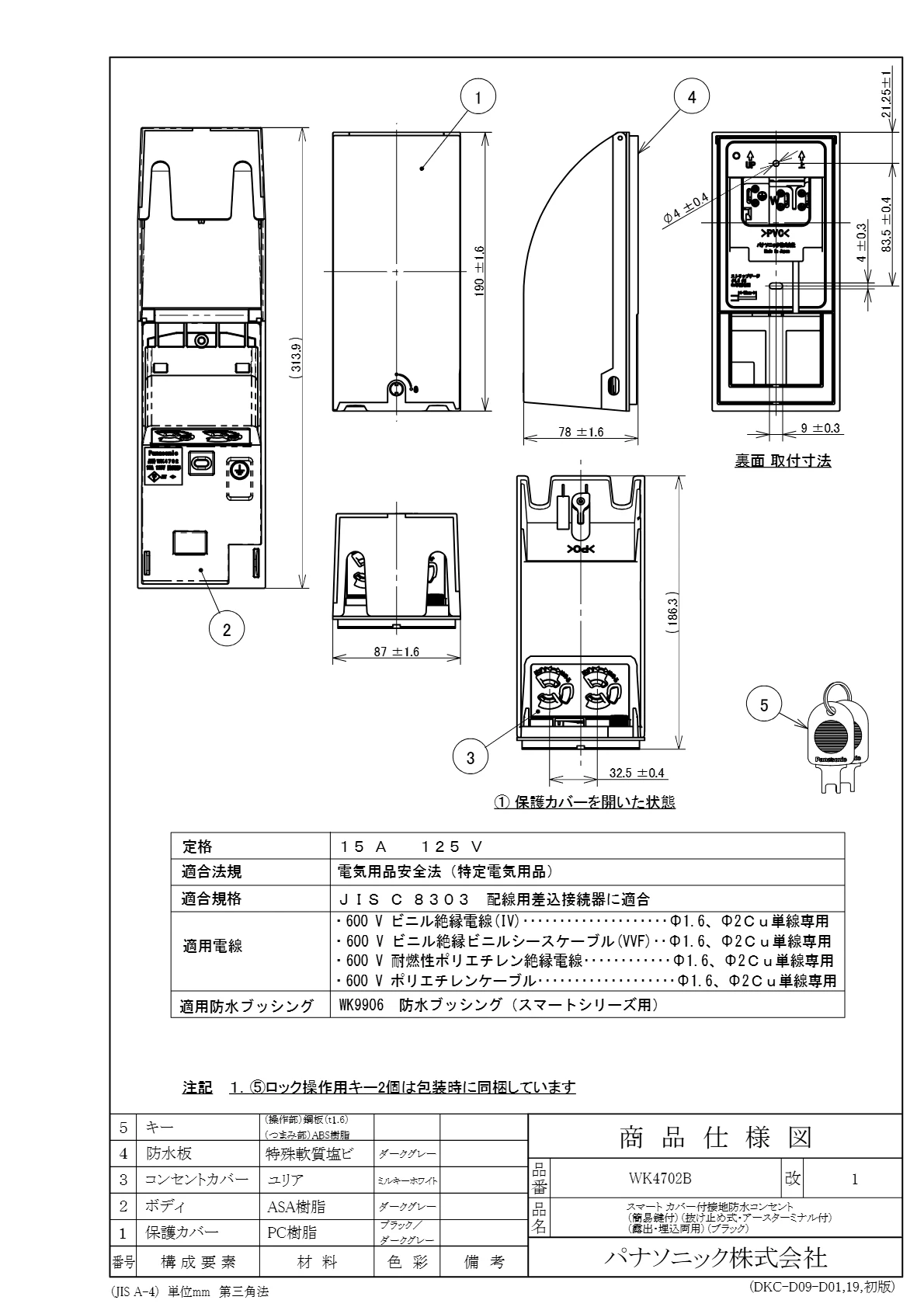 WK4702B スマートカバー付接地防水コンセント(簡易鍵)(抜け止め式・アースターミナル式)(露出・埋込両用)(ブラック)
