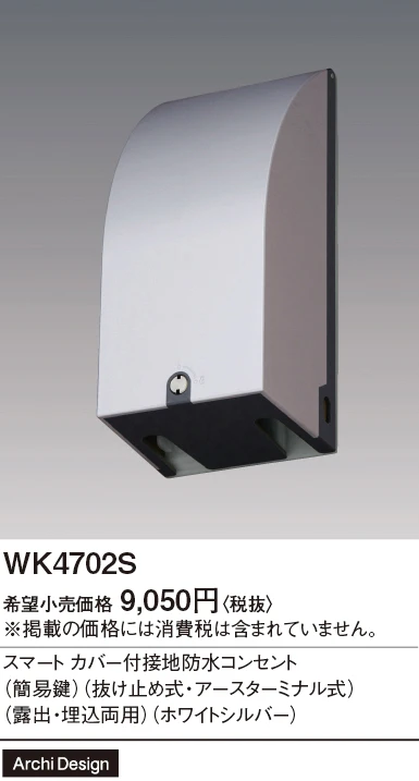 品番:WK4702S品名:スマートカバー付接地防水コンセント(簡易鍵)(抜け止め式・アースターミナル式)(露出・埋込両用)(ホワイトシルバー)
