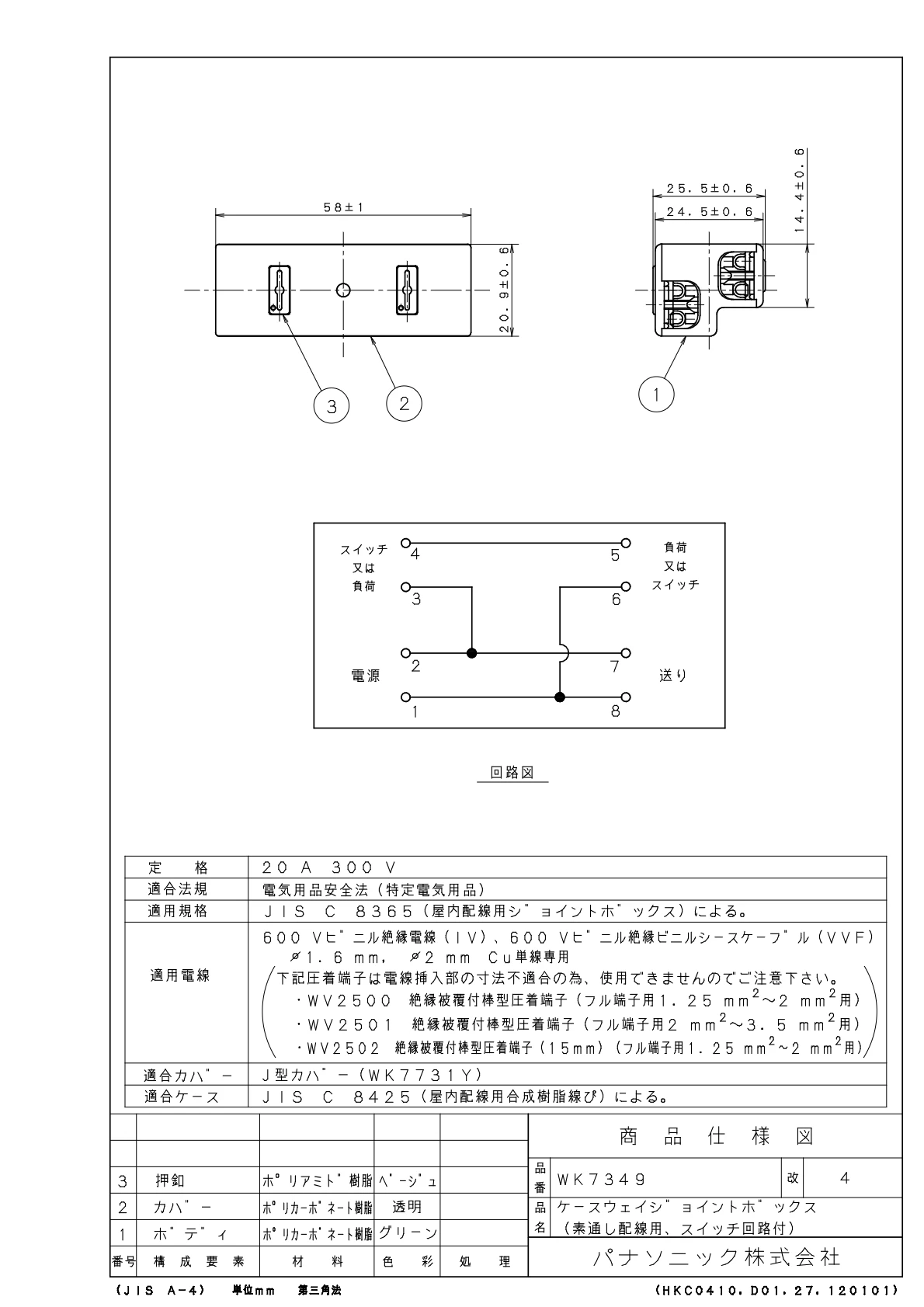 品番:WK7349品名:ケースウェイはめ込みジョイントボックス(素通し配線用)(スイッチ回路付)