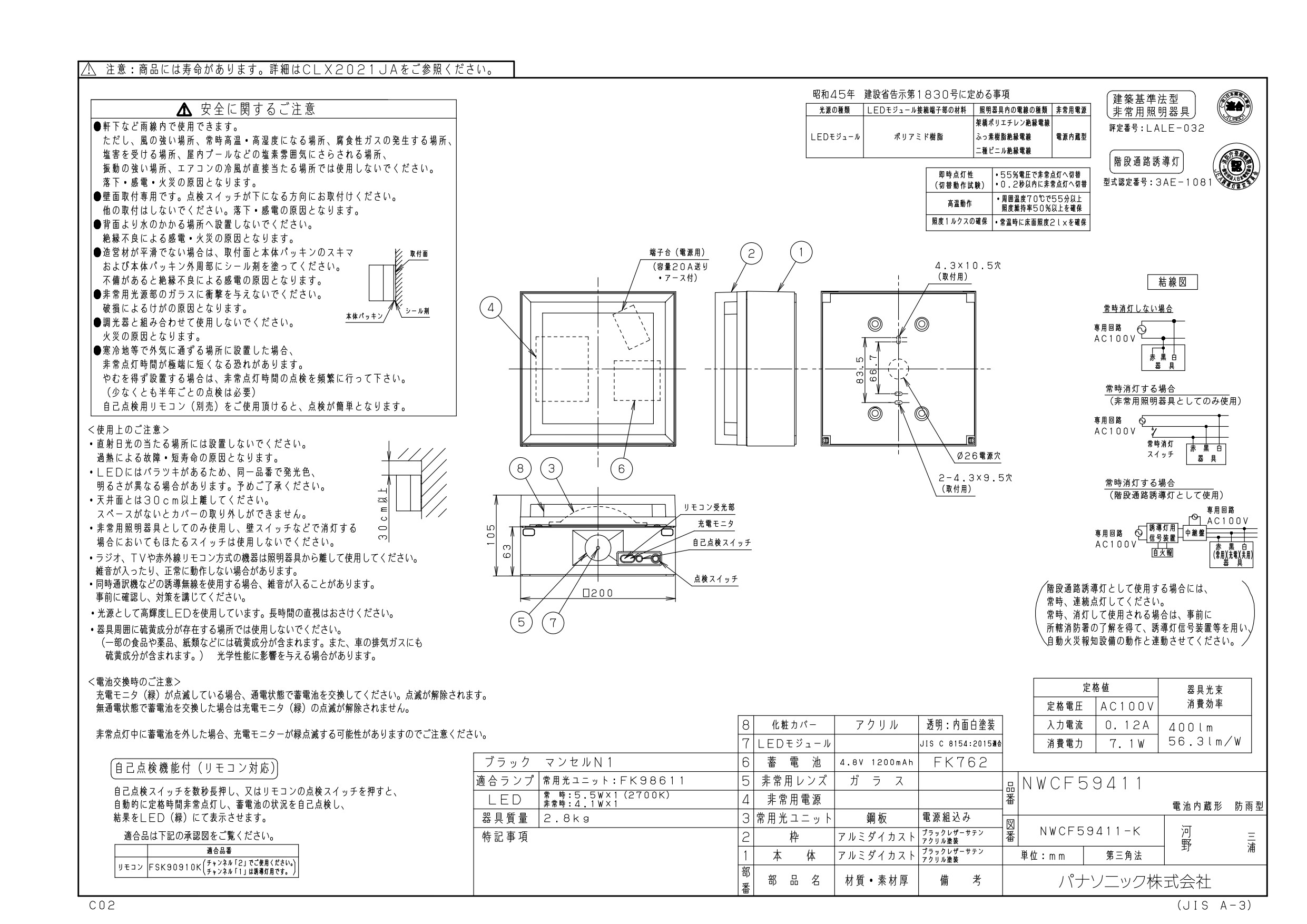 ◆全光束:400lm◆安定器出力型:定格出力型◆安定器補足:<出力固定型>◆電圧:100V◆消費電力:7.1W◆消費効率:56.3lm/W・◆【本体】アルミダイカスト(ブラックレザーサテン仕上)◆【カバー】アルミダイカスト(ブラックレザーサテン仕上)◆【発光部】アクリル(透明・内面白塗装)◆【非常灯レンズ】ガラス◆【蓄電池】ニッケル水素蓄電池◆点検スイッチ付◆自己点検スイッチ付◆充電モニタ(緑)付◆IP23・◆壁直付型、30分間タイプ・◆Ra83(常用光源)◆Ra70(非常用光源)◆型式認定番号:3AE-1081◆非常灯評定番号:LALE-032【交換常用光ユニット】FK98611【交換電池】FK762【リモコン】FSK90910K(別売)◆壁面取付専用◆非常時に点灯する専用LED光源は色温度5000K・演色性Ra70です。◆入力電流(100V時):0.12A・◆注)調光はできません。◆注)写真方向以外取り付け不可◆注)軒下などの雨線内で使用できます。ただし、風の強い場所、常時高温・高湿度になる場所、腐食性ガスの発生する場所、塩害を受ける場所、屋内プールなどの塩素雰囲気にさらされる場所、振動の強い場所、エアコンの冷風が直接当たる場所では使用しないでください。落下・感電・火災の原因となります。◆注)直射日光の当たる場所には設置しないでください。過熱による故障・短寿命の原因となります。◆注)48時間充電してからお使いください。設置後は通電し、蓄電池を充電しないと非常点灯しません。◆注)LEDにはバラツキがあるため、同一品番商品でも商品ごとに発光色、明るさが異なる場合があります。
