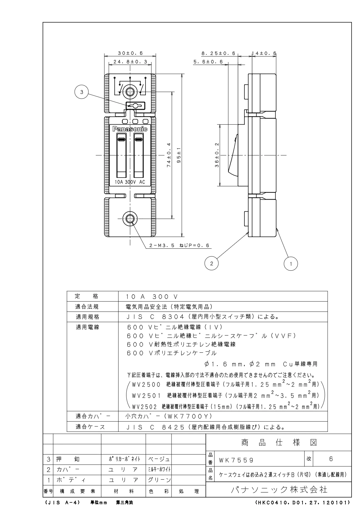 品番:WK7559品名:ケースウェイはめ込み2連タンブラスイッチB(片切)(素通し配線用)