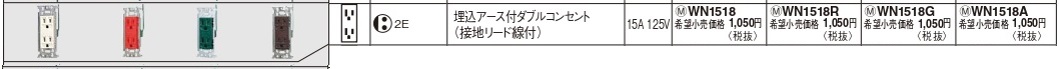 品番:WN1518R品名:埋込アース付ダブルコンセント(接地リード線付)(赤)
