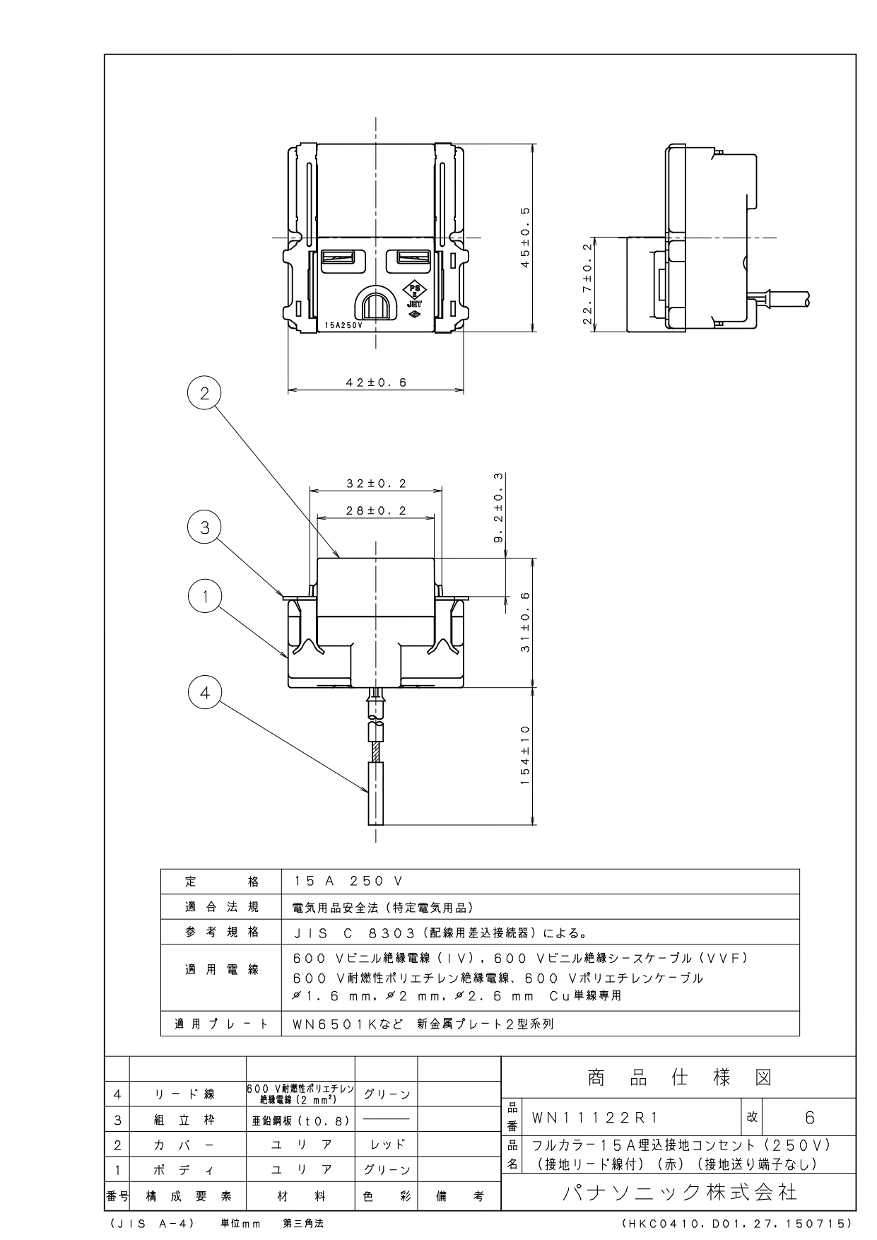 品番:WN11122R1品名:15A埋込アース付コンセント(接地リード線付)(赤)(接地送り端子なし)