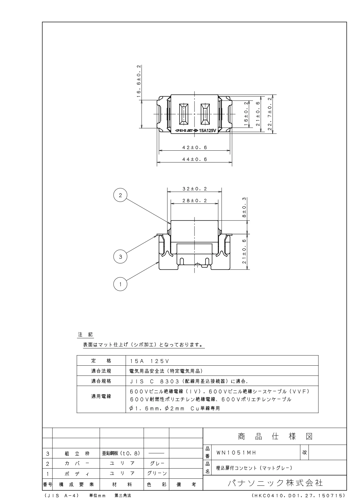 品番:WN1051MH品名:埋込扉付コンセント(マットグレー)