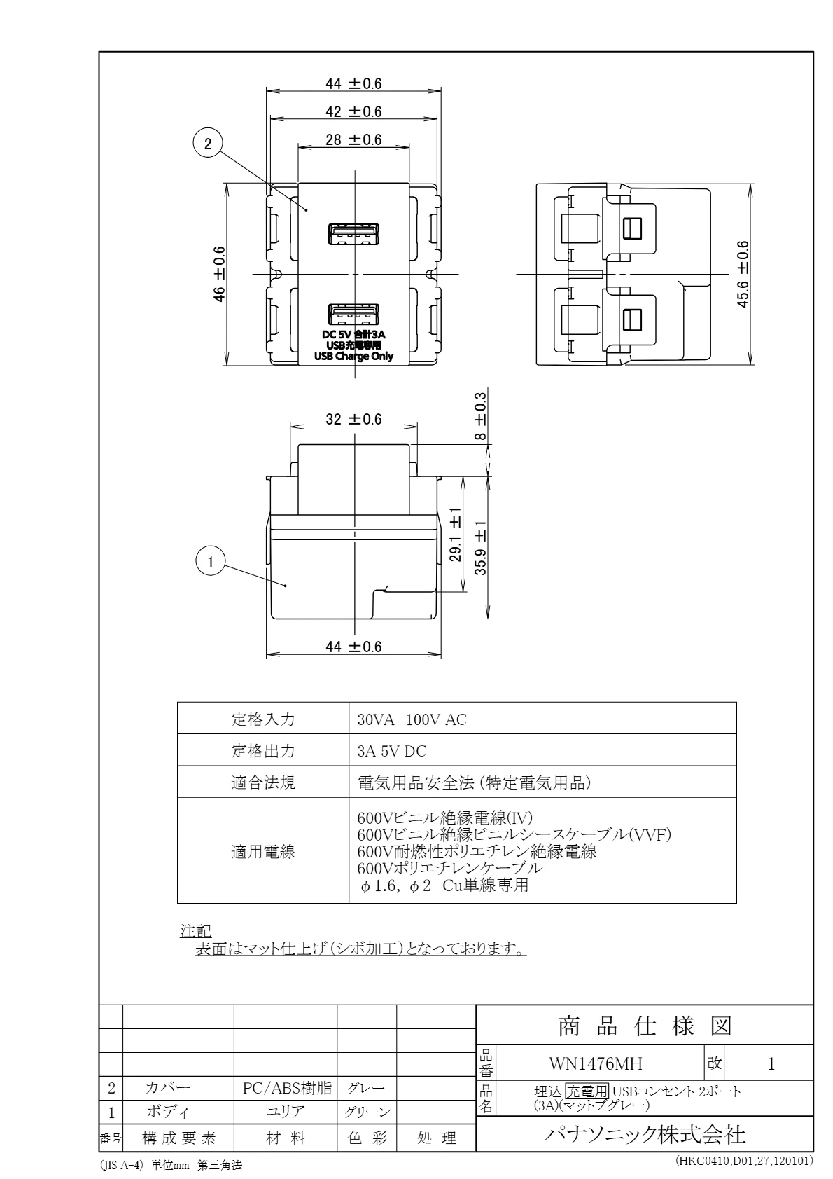 品番:WN1476MH品名:埋込[充電用]USBコンセント2ポート(3A)(マットグレー)