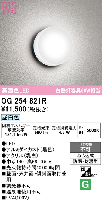 OG254821R ブラケット 壁面・天井面・傾斜面取付兼用 非調光・電球色 白熱灯60W相当 調光器不可 温泉地不可
