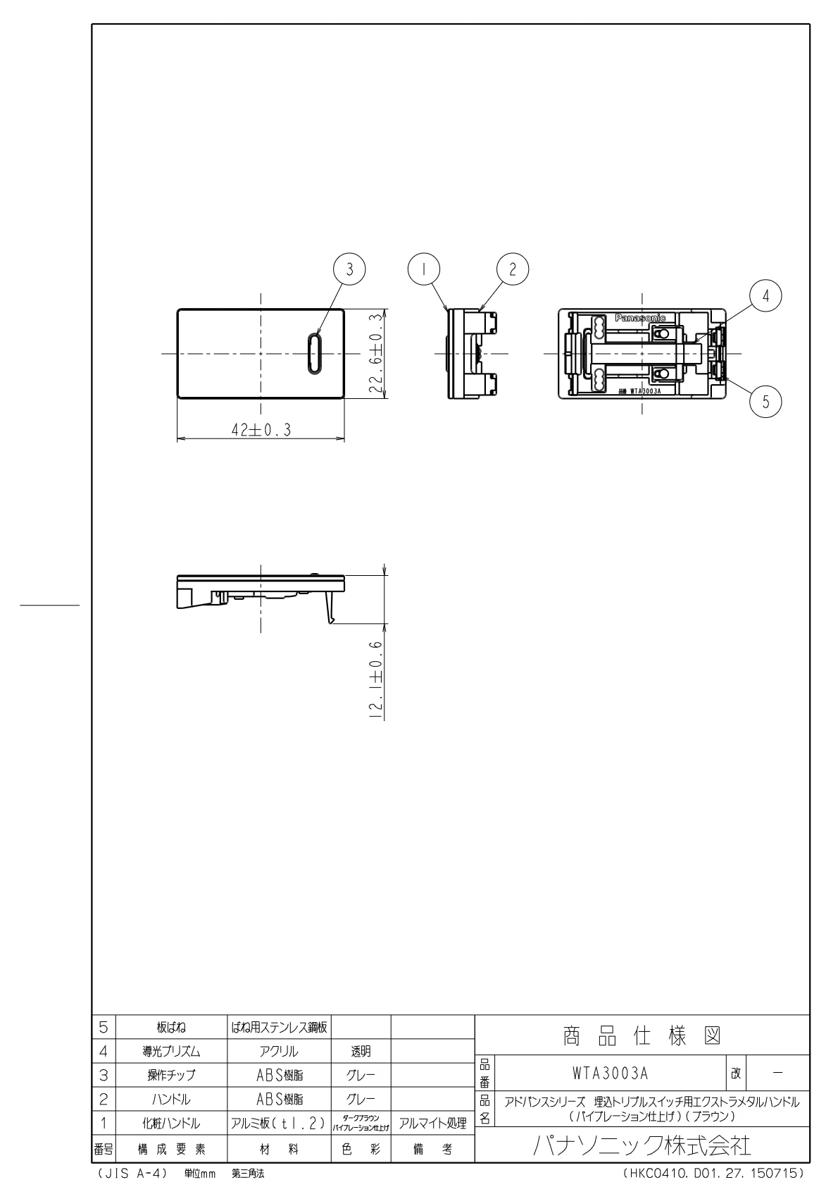 品番:WTA3003A品名:アドバンスシリーズ 埋込トリプルスイッチ用エクストラメタルハンドル (バイブレーション仕上げ)(ブラウン)