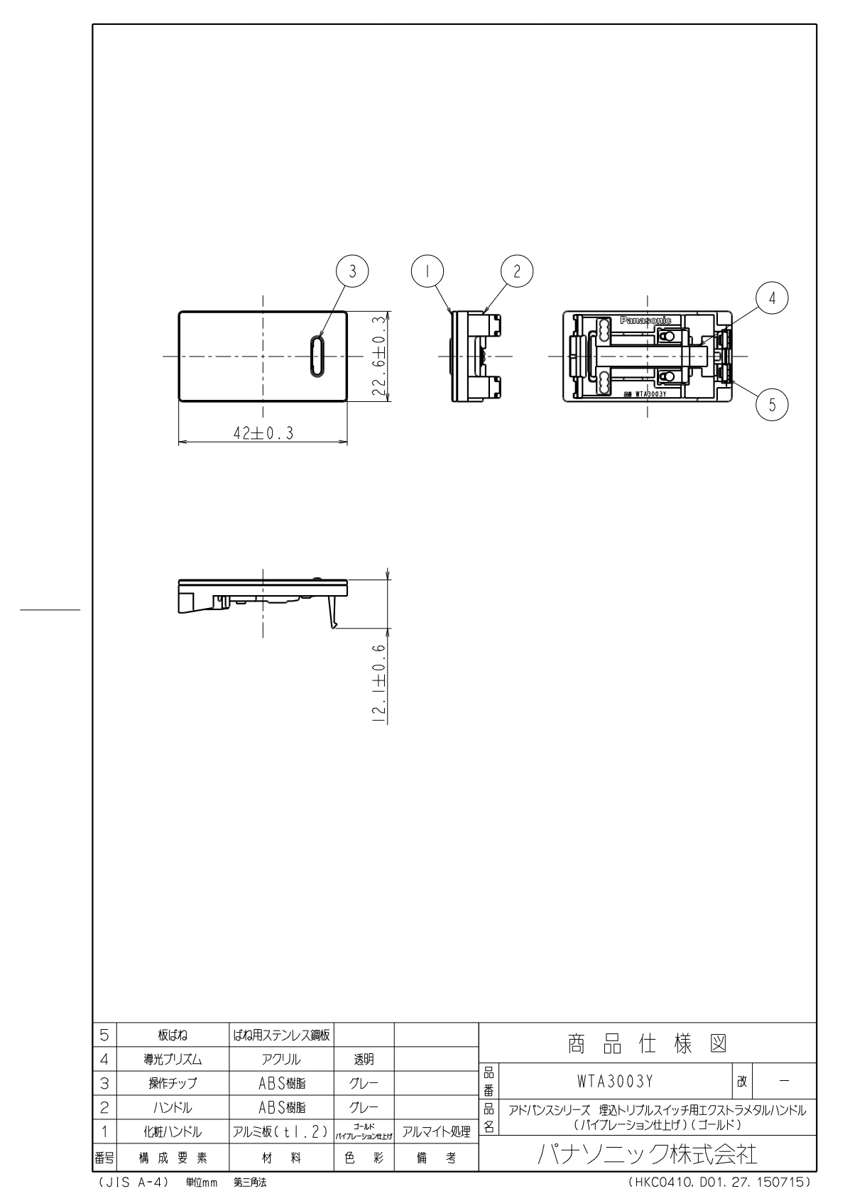 品番:WTA3003Y品名:アドバンスシリーズ 埋込トリプルスイッチ用エクストラメタルハンドル (バイブレーション仕上げ)(ゴールド)
