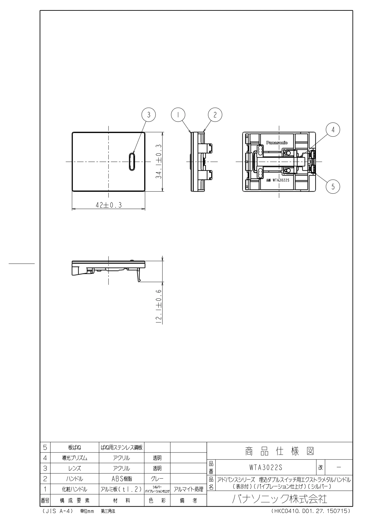 品番:WTA3022S品名:アドバンスシリーズ 埋込ダブルスイッチ用エクストラメタルハンドル (表示付)(バイブレーション仕上げ)(シルバー)