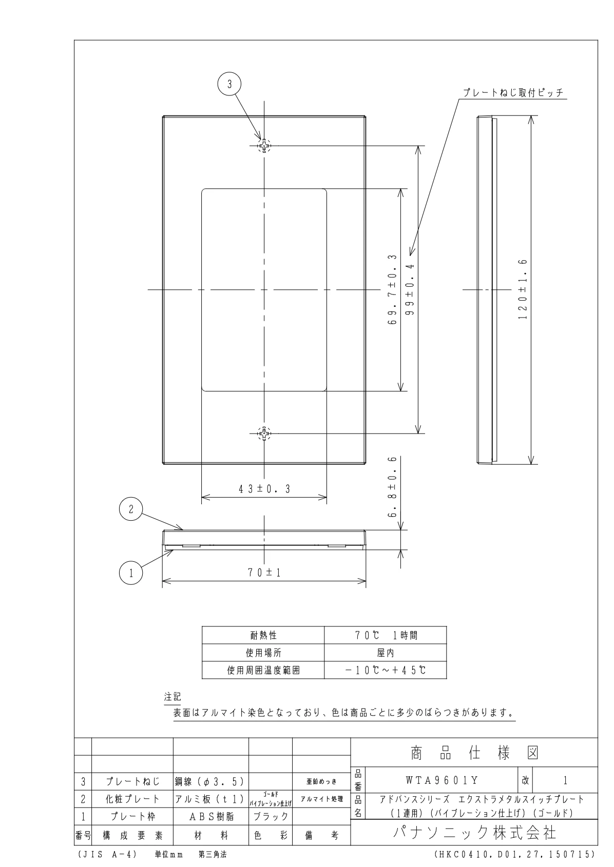 品番:WTA9601Y品名:アドバンスシリーズエクストラメタルスイッチプレート(1連用)(バイブレーション仕上げ)(ゴールド)