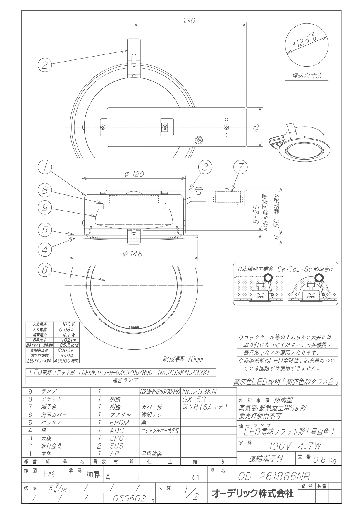 OD261866NR LEDフラット型軒下用ダウンライト φ125 防雨型 60W相当 拡散配光 非調光・電球色 枠:マットシルバー