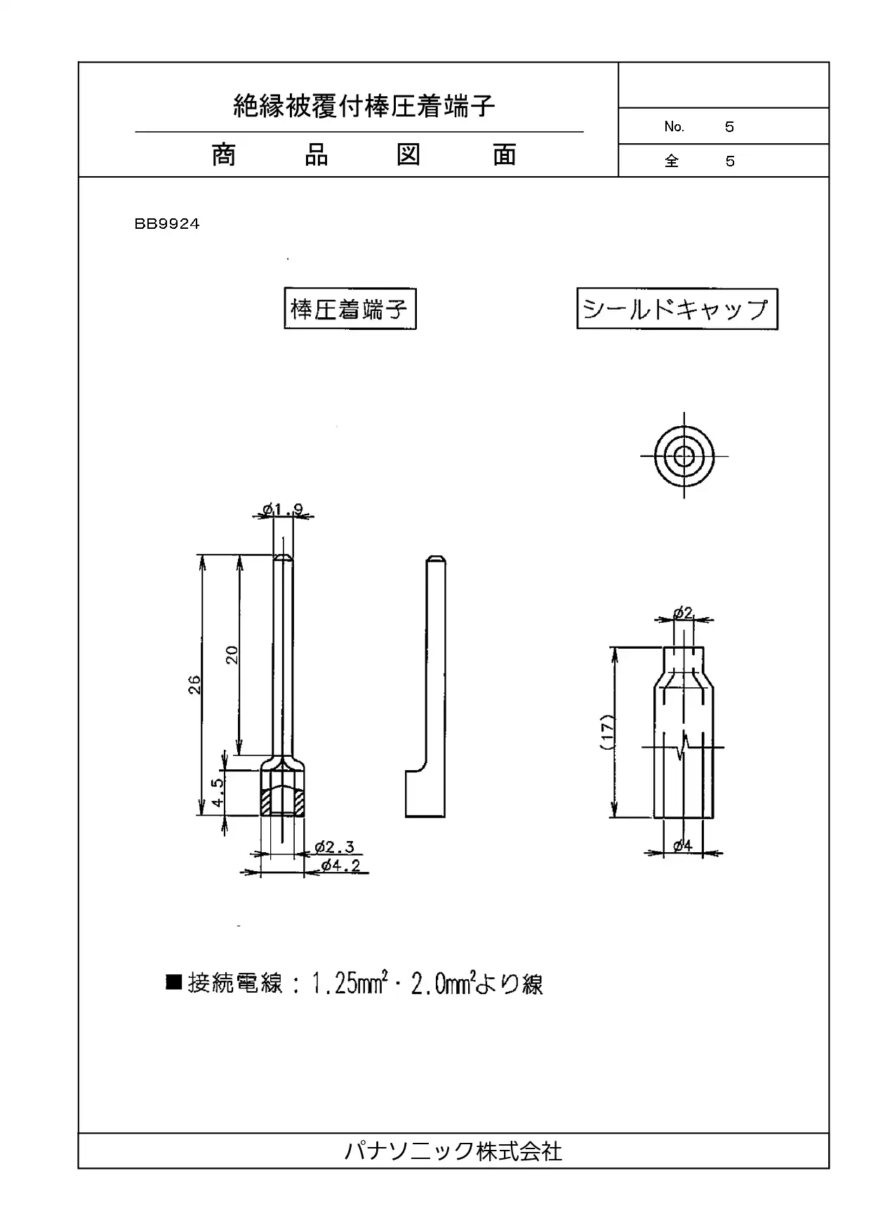BB9924 棒型圧着端子(絶縁キャップ付) より線サイズ1.25平方mm 2.0平方mm 20個入り