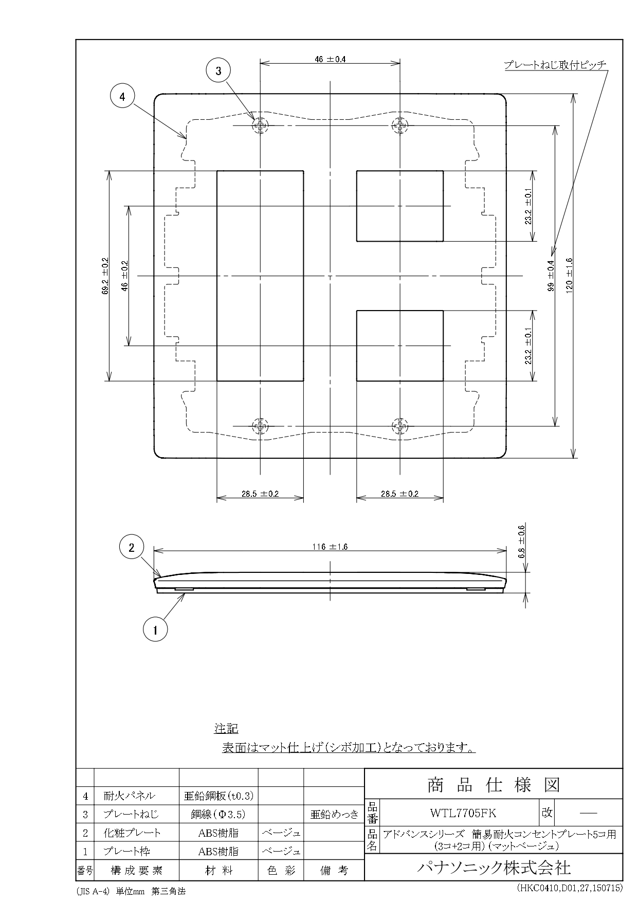 WTL7705FK アドバンス 簡易耐火コンセントプレート5コ用(3コ+2コ用)(マットベージュ)