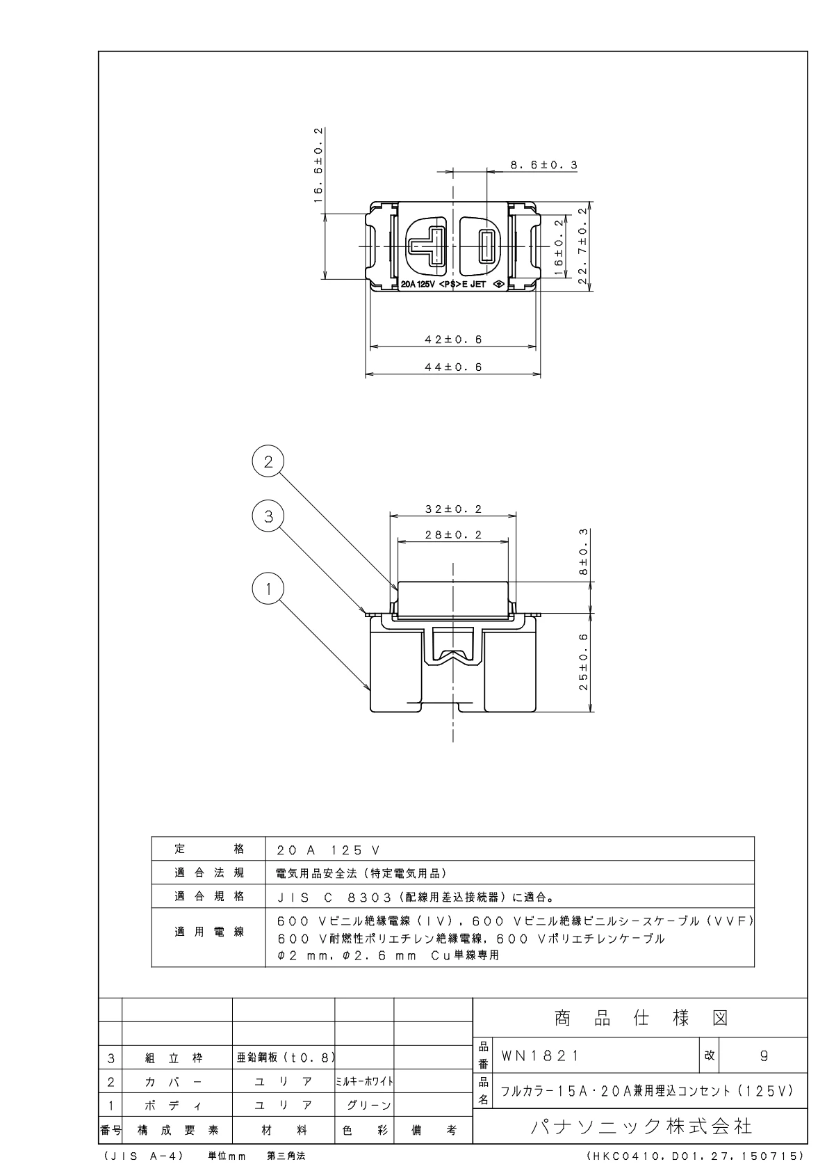 WN1821 15A・20A兼用埋込コンセント