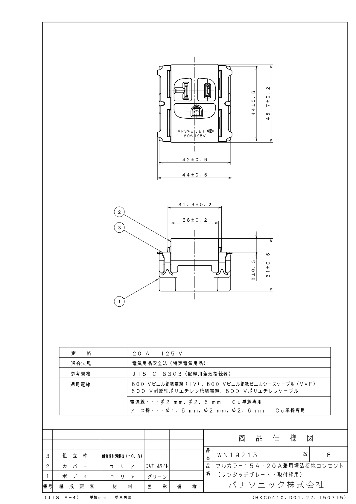 品番:WN1921315A・20A兼用埋込接地コンセント