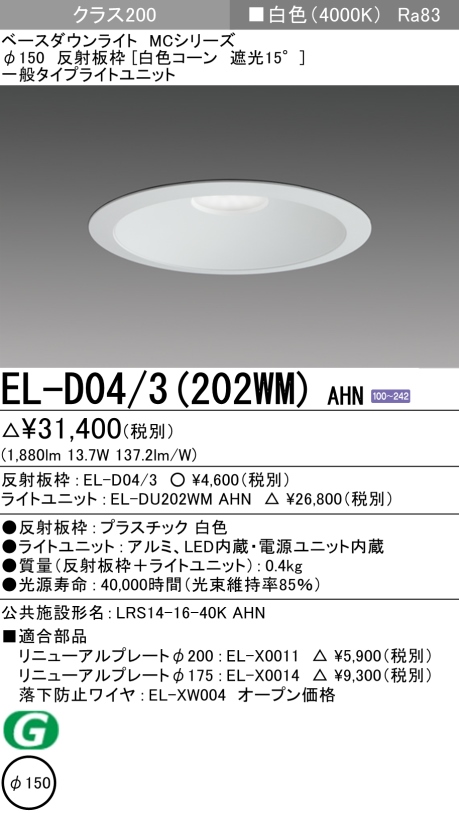 固有エネルギー消費効率(lm/w):154.2(200V時)