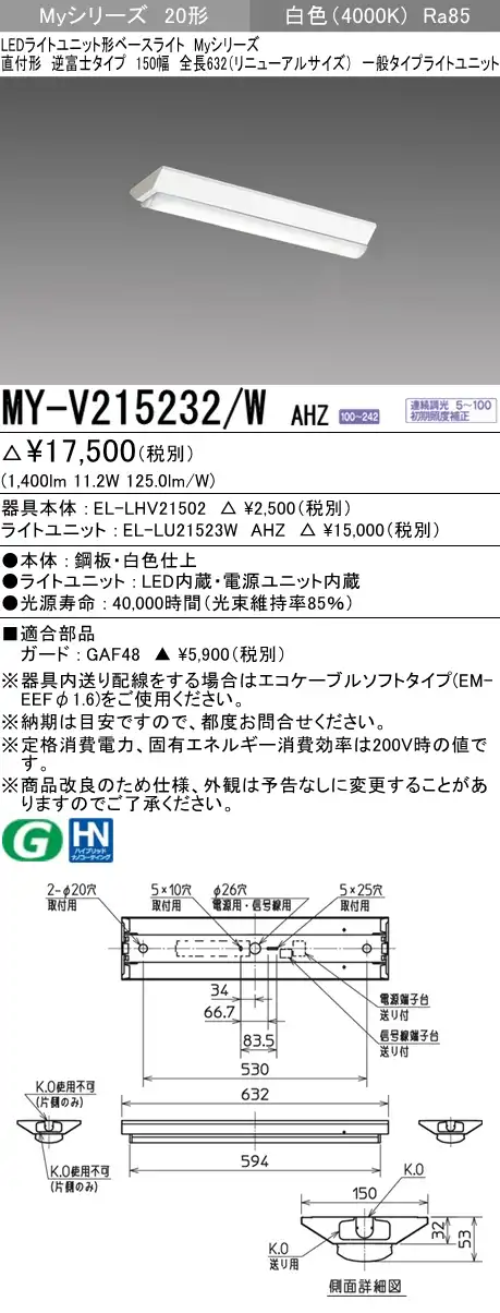 MY-V215232/W AHZ 逆富士形(V形)照明器具 150幅 全長632 FHF16x1(FL20x2)相当 白色 調光タイプ