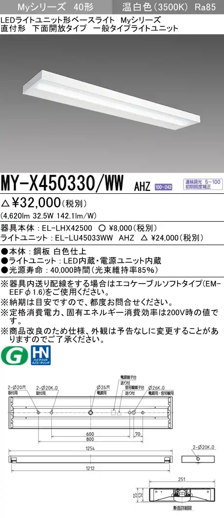 MY-X450330/WW AHZ 直付下面開放形照明器具 FHF32(定格)x2相当 温白色 調光タイプ