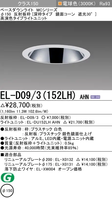 固有エネルギー消費効率(lm/w):151.0(200V時)