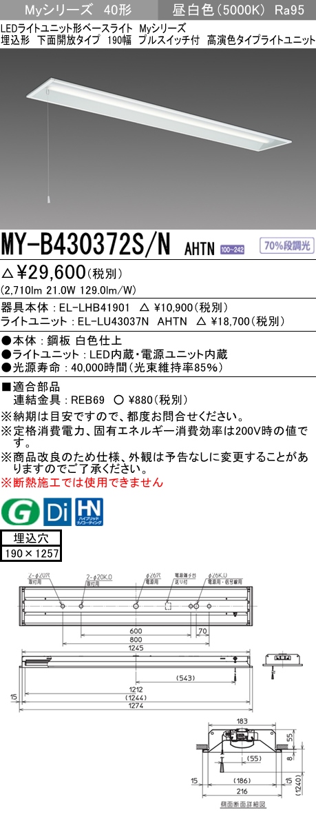 MY-B430372S/N AHTN 埋込形ベースライト 190幅 高演色タイプ FHF32(高出力)x1相当 昼白色 プルスイッチ付