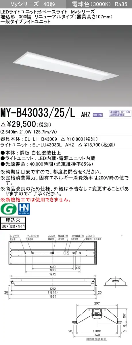 MY-B43033/25/L AHZ 埋込形ベースライト 300幅 器具高さ107mm FHF32(高出力)x1相当 電球色 調光タイプ
