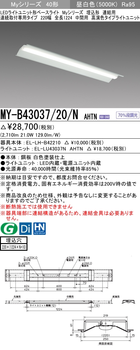 MY-B43037/20/N AHTN 埋込形ベースライト 連結用 220幅 全長1224 高演色タイプ FHF32(高出力)x1相当 昼白色 中間用
