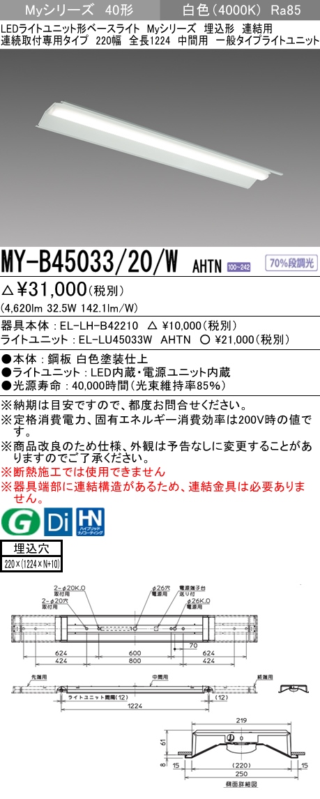 MY-B45043/20/W AHTN 埋込形ベースライト 連結用 220幅 全長1224 FHF32(定格)x2相当 白色
