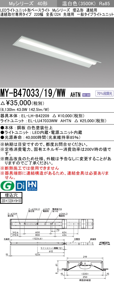MY-B47043/19/WW AHTN 埋込形ベースライト 連結用 220幅 全長1224 FHF32(高出力)x2相当 温白色