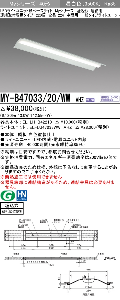 MY-B47043/20/WW AHZ 埋込形ベースライト 連結用 220幅 全長1224 FHF32(高出力)x2相当 温白色 調光タイプ