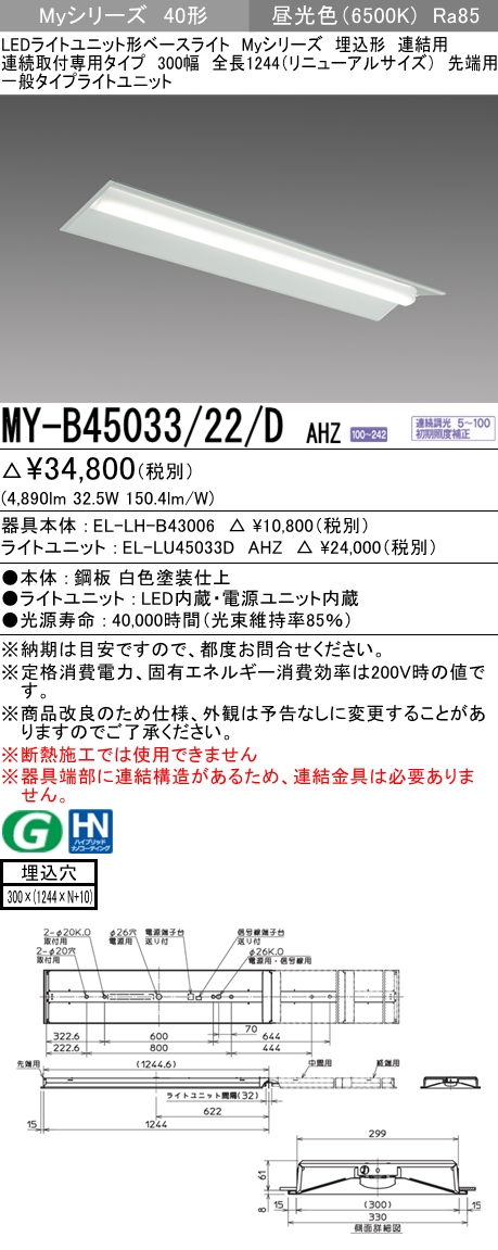 MY-B45043/22/D AHZ 埋込形ベースライト 連結用 300幅 全長1244 FHF32(定格)x2相当 昼光色 調光タイプ