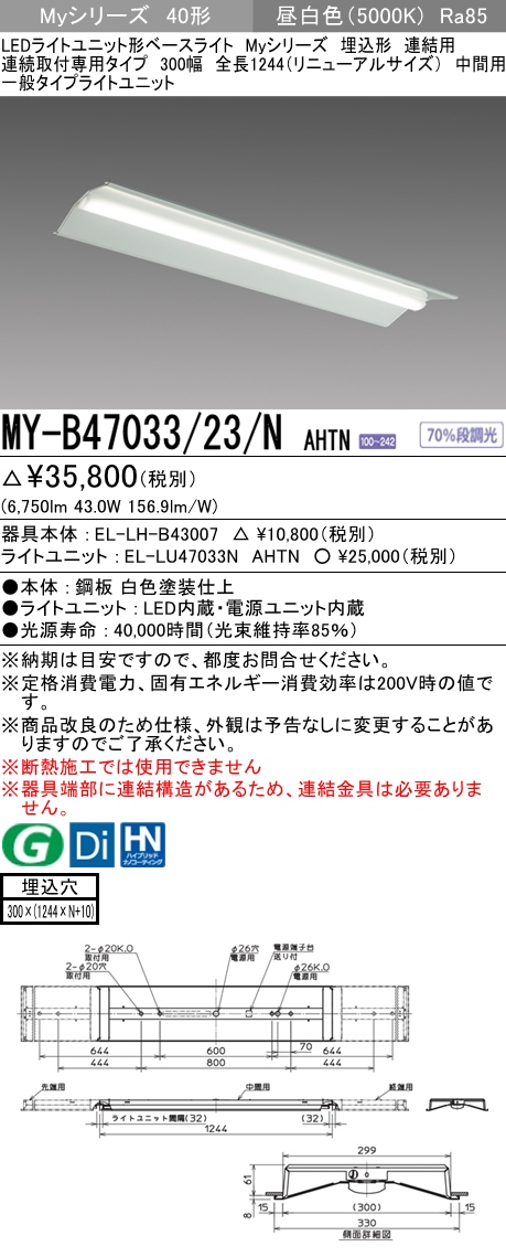 MY-B47043/23/N AHTN 埋込形ベースライト 連結用 300幅 全長1244 FHF32(高出力)x2相当 昼白色