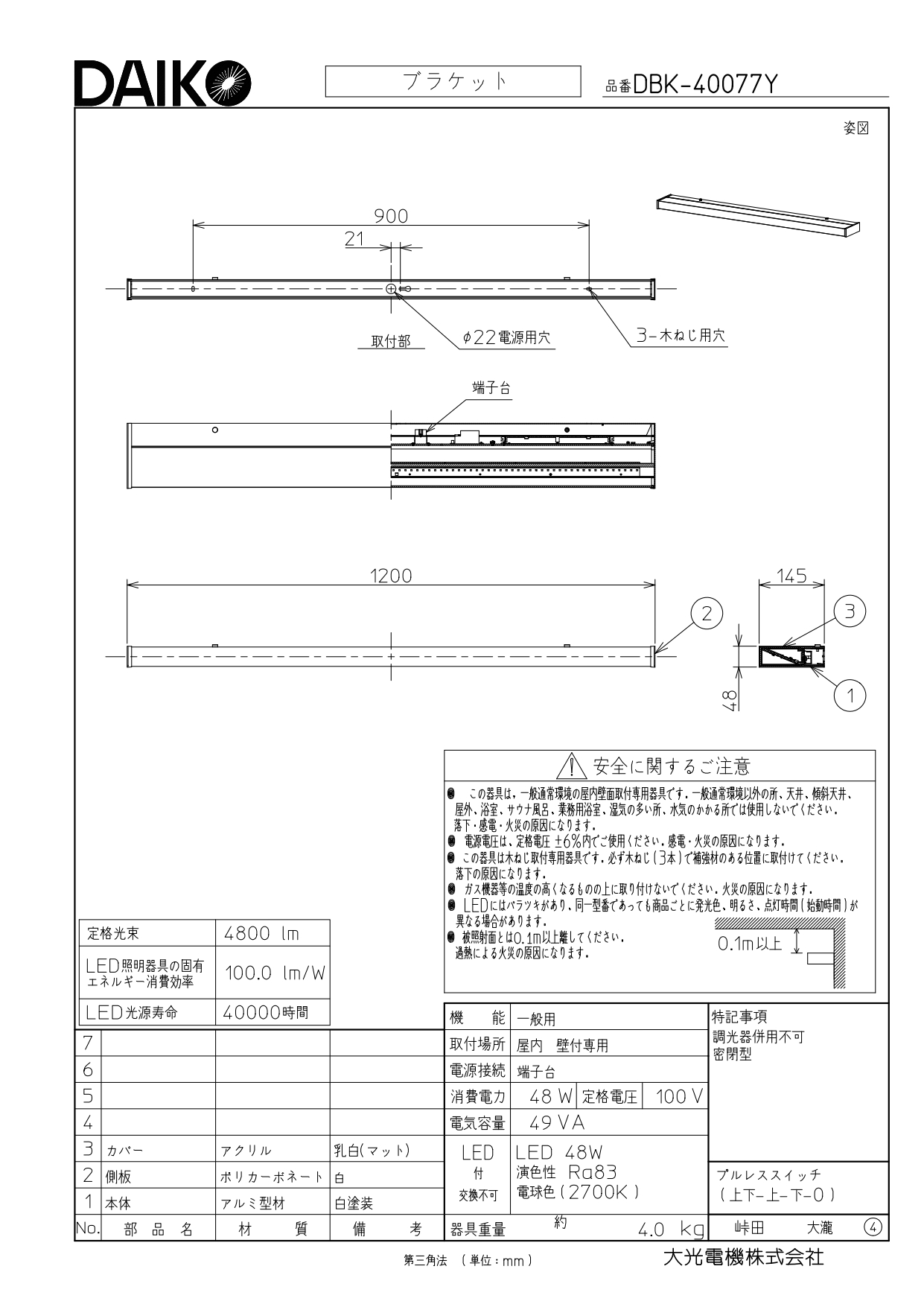 【器具寸法】巾1200 高50 出145mm