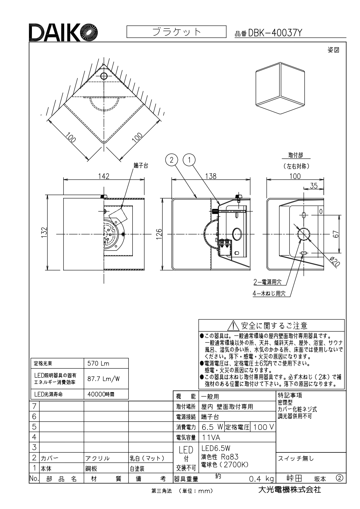【仕様・注意事項】LED交換不可■密閉型■調光器併用不可カバー:アクリル 乳白(マット)光源寿命:光源寿命40000時間