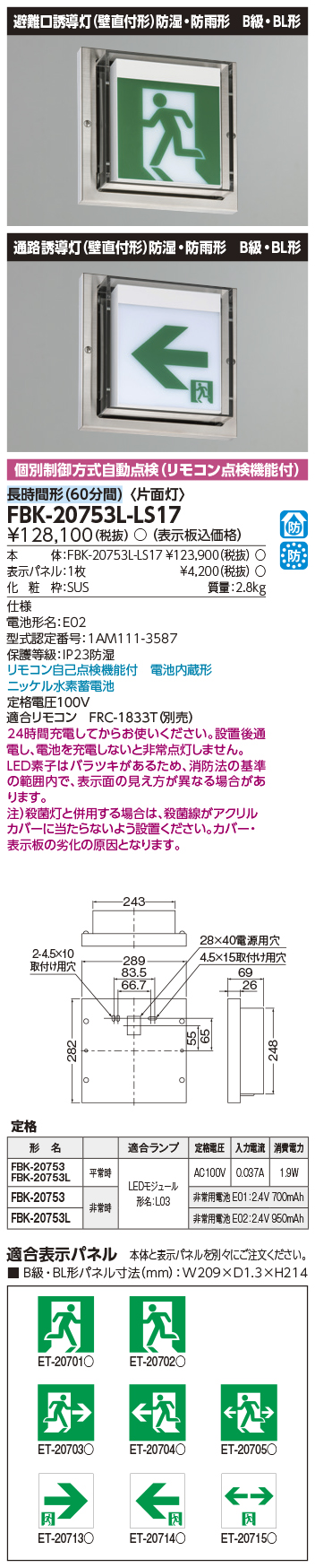 FBK-20753L-LS17 LED壁直付防湿防雨型誘導灯(非常時60分間点灯)B級BL形(20B形)本体のみ
