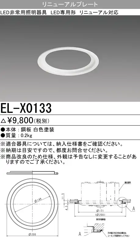 埋込形非常用照明用 リニューアルプレート φ175穴→φ150 EL-X0133
