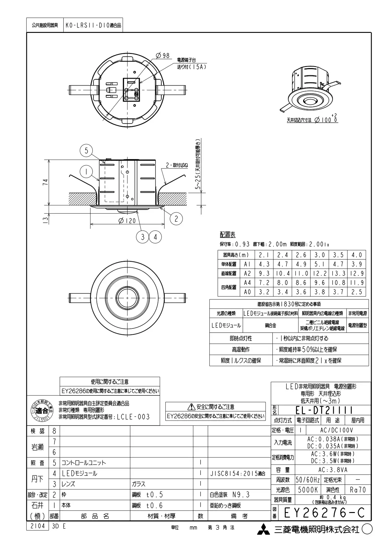 品番:EL-DT21111品名:LED非常照明 電源別置(バッテリーなし)形 埋込形 φ100 低天井用(~3m)