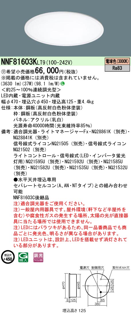 NNF81603KLT9 ベースライト スクエアシリーズ 埋込型φ450 乳白パネル 調光 電球色