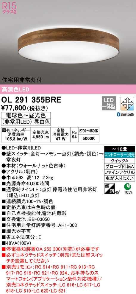 OL291355BRE 住宅用非常灯(昼白色)付シーリングライト クイック取付A 12畳まで 調光調色 コントローラ別売