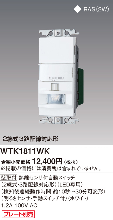 [壁取付]熱線センサ付自動スイッチ (2線式・3路配線対応形)(LED専用)(検知後連続動作時間約10秒 - 30分可変形)(明るさセンサ・手動スイッチ付)WTK1811WK