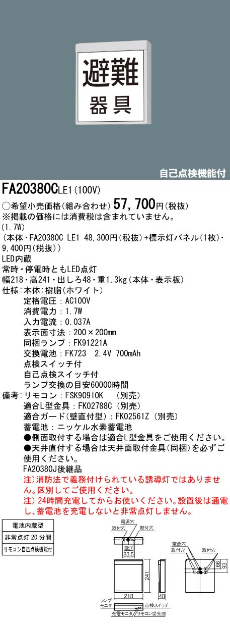 FA20380CLE1+FK20391 LED防災設備標示灯 片面+『避難器具』パネルセット