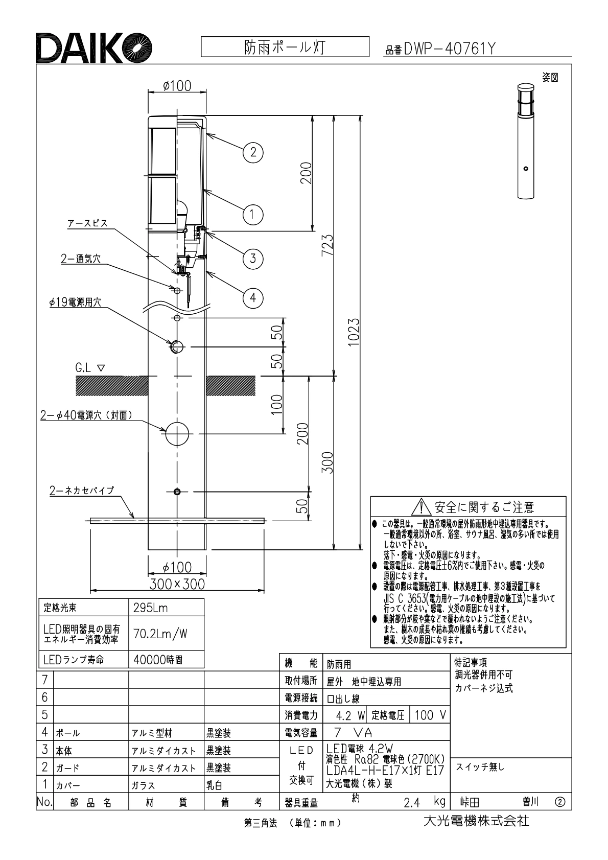 DWP-40761Y ポールライト 地上高700mm 非調光・電球色 LEDランプ付(E17) ランプ交換可 本体色:黒