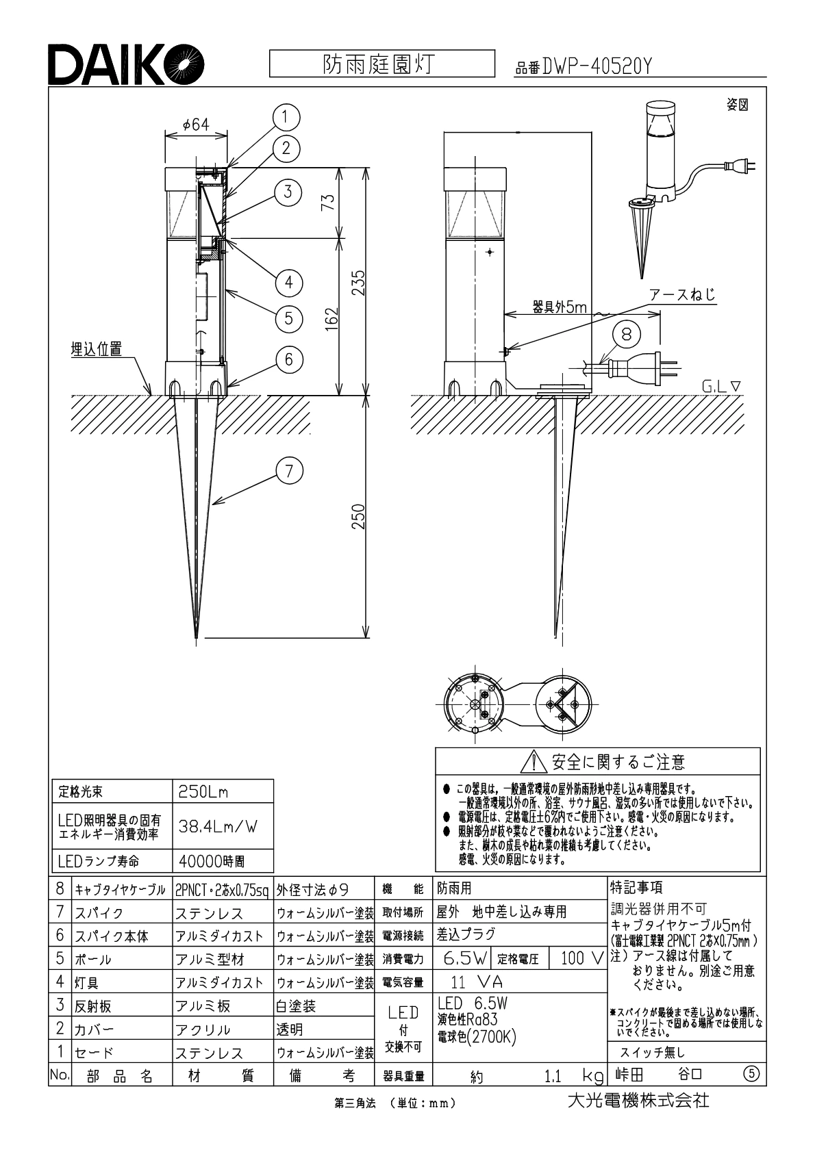DWP-40520Y ポールライト スパイクタイプ 地上高235mm 非調光・電球色 LEDランプ一体型 交換不可 本体色:ウォームシルバーシルバー