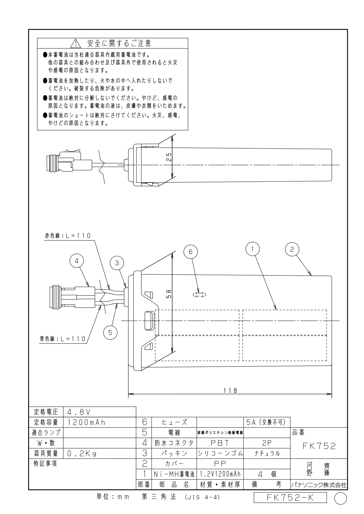 品番:FK752品名:ニッケル水素蓄電池 バッテリー 4.8V 1200mAh