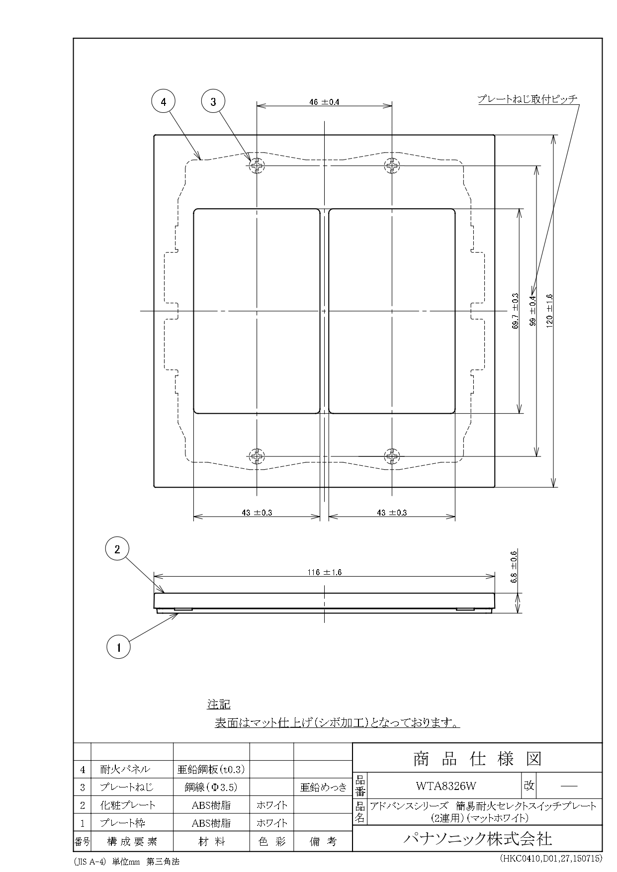 品番:WTA8326W品名:アドバンスシリーズ 簡易耐火セレクトスイッチプレート(2連用)(マットホワイト)