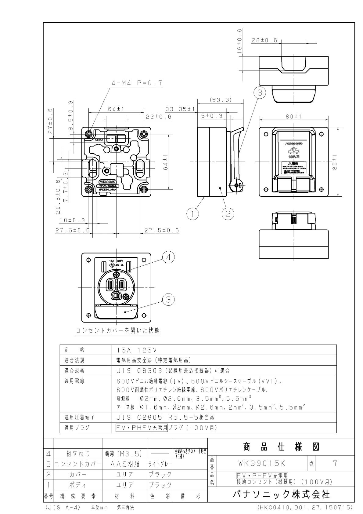 品番:WK39015K品名:(機器用)(100V用)EV・PHEV充電用接地コンセント